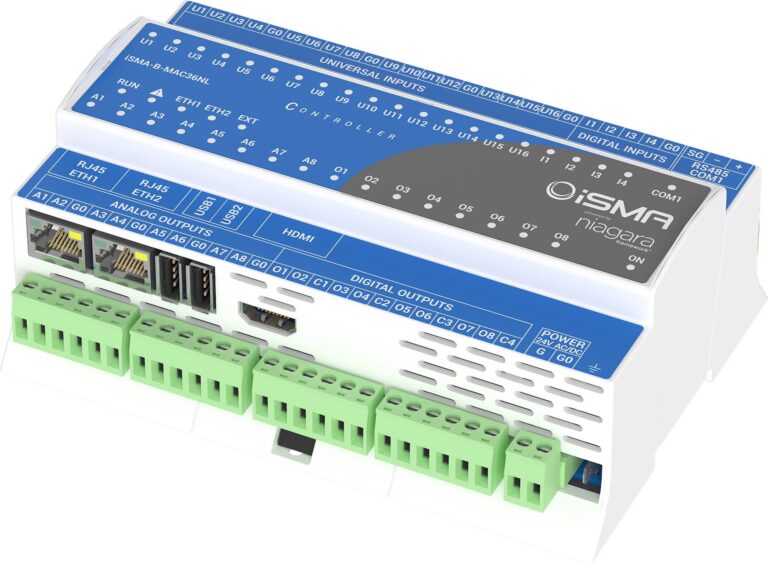 A member of the iSMA-B-MIX Series module family with 12 digital inputs, 8 universal inputs, 6 analog outputs, 12 relay outputs, and RS485 communications.